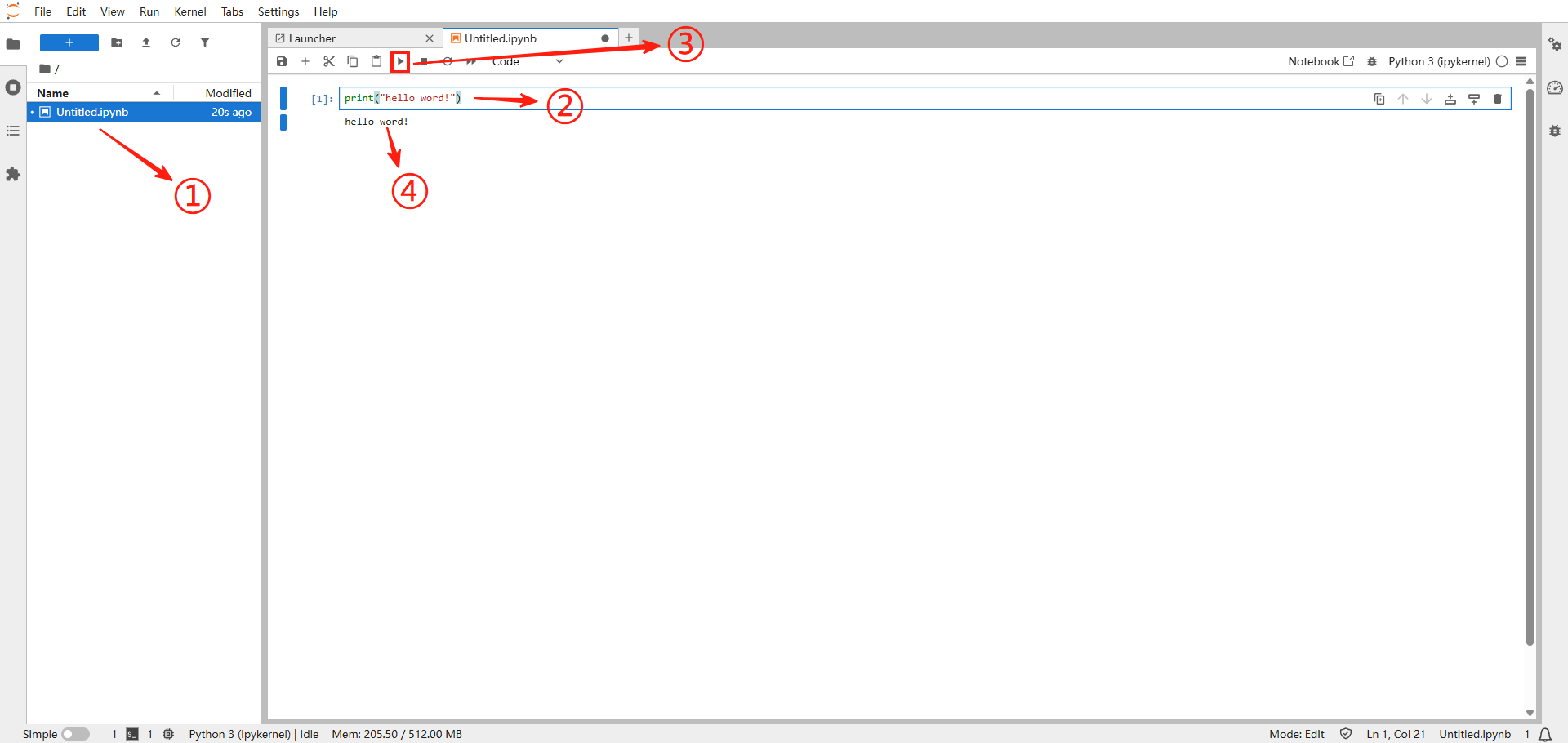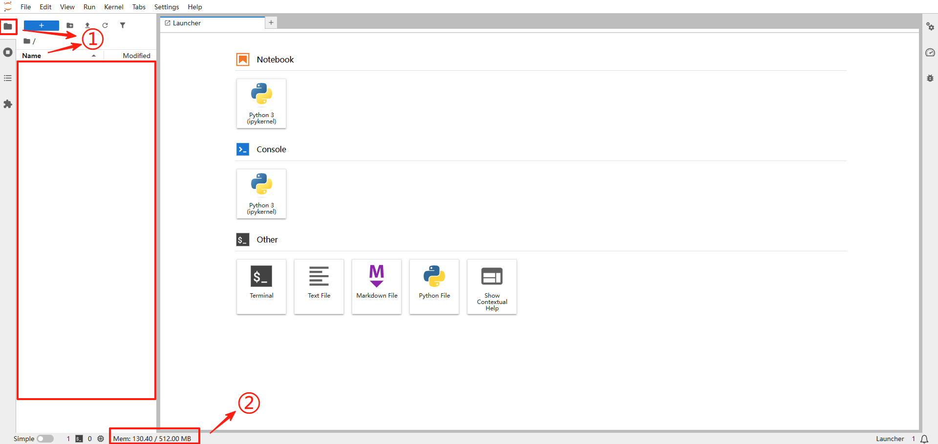①:文件管理:此处可以看到创建的Jupyter Notebook文件(可以理解为于python代码文件,但实际上还包含了输出的记录)和其他文件